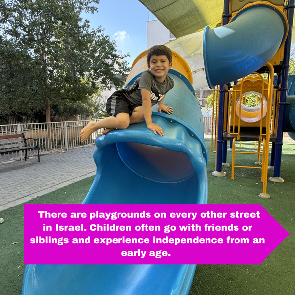 👉 In America, I am considered a “relaxed parent.” But in Israel I would probably be called a helicopter parent! Parents in Israel let their kids be independent from a shockingly young age. Seven year olds are walking to the store to pick up milk and eggs for the family…. sometimes with younger siblings accompanying them.